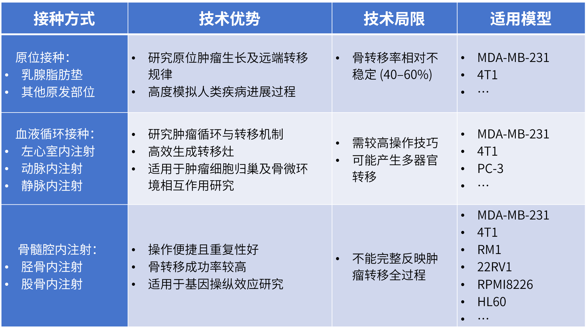 依托对骨转移疾病机制的深入洞察,澎立生物成功构建了具有高度转化价值的癌症骨转移技术平台(BMTP©)。该平台整合了多种经过严格验证的疾病模型,建立了覆盖不同转移路径的综合研究体系,并配套系统化的评价指标,可为骨转移相关基础机制探索和创新药物研发提供坚实可靠的技术支撑。
