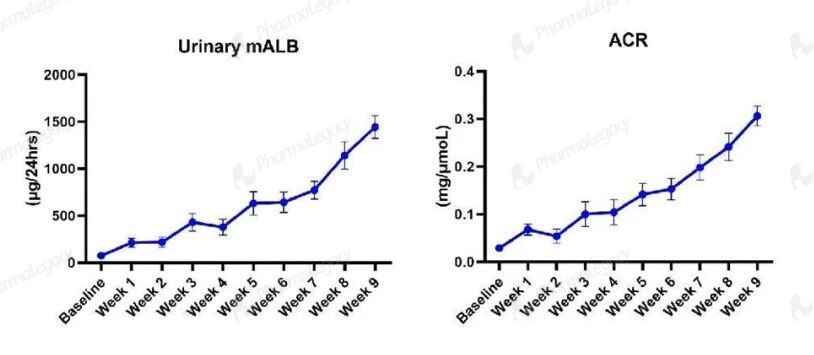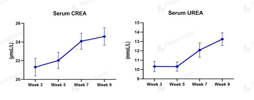 肾功能血清学指标:血清肌酐(CREA)和尿素氮(UREA)随周龄逐渐升高;在 Alport 小鼠中,这一趋势再现了人类 Alport 综合征肾功能进行性衰退的临床特征,为肾保护药物评价提供了可靠依据。