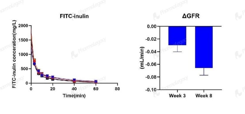 肾小球滤过功能:FITC‑inulin 清除实验显示,GFR 自基线至 8 周显著、进行性下降,直接量化了 Alport 综合征中肾小球滤过功能的进行性减退;这一变化与临床 eGFR 持续下降的病程一致,可作为评价肾功能保护药物疗效的精准功能学终点。