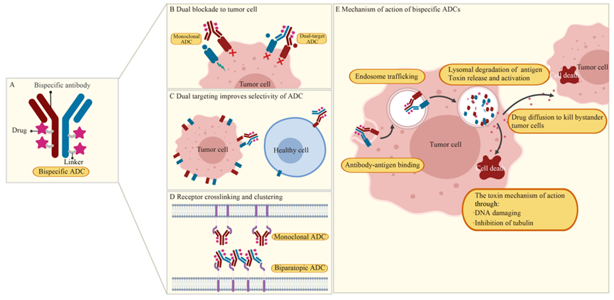 在上述情况下,问题的本质往往并不在于“抗体是否足够优秀”,而在于单一表位的识别逻辑已经无法同时满足肿瘤靶向的选择性与肿瘤细胞的覆盖度要求。这也正是双抗ADC架构被提出的现实背景。双抗ADC的初衷并非单纯追求更强的肿瘤杀伤能力,而是通过引入第二个识别维度,更精准地界定“哪些细胞应当被递送payload”,从而在系统层面同时优化疗效与安全性,突破单抗ADC原有局限。