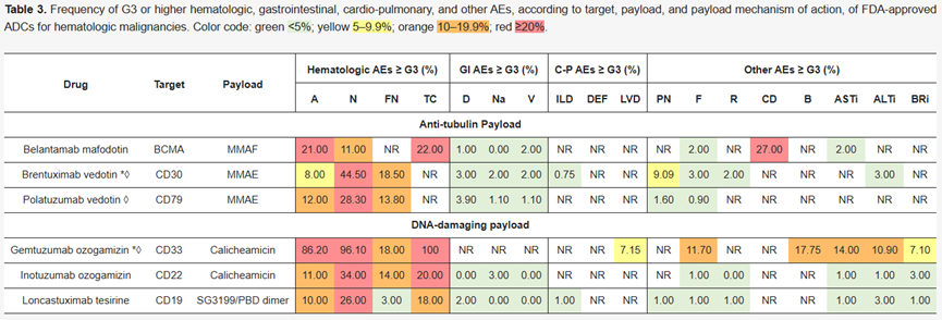 以微管抑制剂类payload为例,外周神经病变和骨髓抑制在多个采用MMAE或MMAF的ADC中反复出现;maytansinoid类payload则长期与血小板减少和肝毒性相关;而拓扑异构酶I抑制剂类payload虽然在实体瘤中显示出更强的疗效潜力,也同时带来了间质性肺病、胃肠道毒性等新的安全性挑战。类似现象在不同项目间高度复现,说明这些毒性更接近payload作用机制在系统暴露背景下的延伸结果,而非偶发事件。