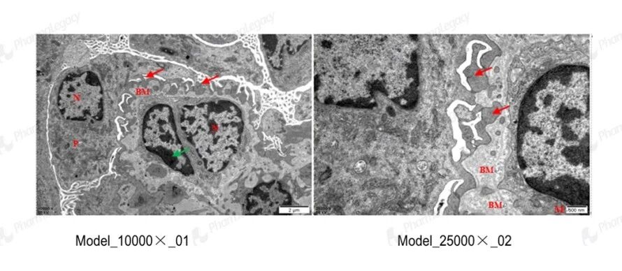 肾组织电镜:Alport 小鼠肾组织电镜结果,高度还原了人类 X 连锁 Alport 综合征的特征性病理改变。电镜下可见肾小球毛细血管基底膜(GBM)显著增厚、厚薄不均、凹凸不平,完全复刻了 Alport 综合征标志性的 GBM 结构异常,是临床电镜诊断的核心依据;同时出现足细胞足突广泛融合、变短(红色箭头),直接对应患者蛋白尿发生的结构基础;系膜细胞核染色质边集(绿色箭头)则提示细胞活化,与肾纤维化、肾功能进行性衰退的临床病程高度吻合,为 Alport 综合征机制研究与药物评价提供了理想的病理模型支撑。