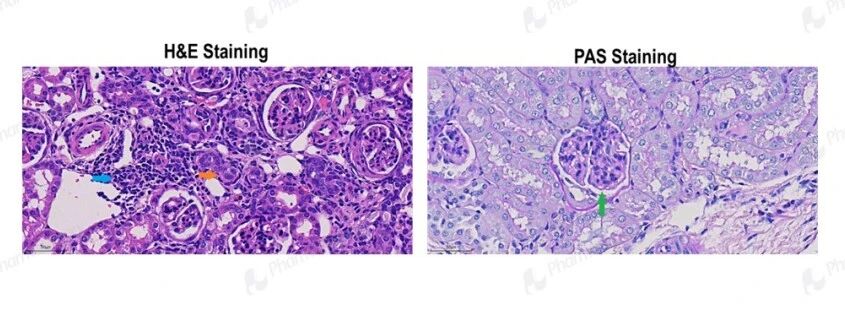 肾组织光镜:Alport 小鼠肾组织 H&E 与 PAS 染色结果,高度复刻了人类 Alport 综合征的典型光镜病理特征。H&E 染色可见明显炎症细胞浸润(蓝色箭头)、肾小管萎缩损伤(橙色箭头);PAS 染色清晰显示肾小球基底膜增厚(绿色箭头),与电镜超微结构改变相互印证。这些病理改变精准对应 Alport 综合征患者肾组织的炎症浸润、肾小管间质损伤及基底膜病变,与蛋白尿、肾功能进行性衰退的临床表现高度一致,为疾病机制研究与药物疗效评价提供了可靠的形态学依据。